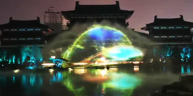 九洲池景區水幕電影項目,位于洛陽市西工區定鼎北路與唐宮中路交叉口。水幕高12米,與實景演出結合,船影水幕漂浮在空中,讓您身處奇幻意境感受著震撼的視聽、夢幻的舞美,一起夢回大唐!