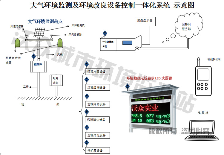 1、 本系統集成化高,功能強大。不但可以對環境數據進行實時監測還可對環境大氣治理設備進行開啟、關閉、定時等遠程控制。系統分為兩大部分,一部分為環境數據實時監測(包含有:風速、風向、溫度、濕度、大氣壓、PM2.5、PM10、二氧化硫SO2、一氧化氮、CO、臭氧O3等大氣環境參數),一部分為環境治理設備及其他相關設備的遠程遙控控制。兩部分可分開運行也可獨立運行,本系統核心為
