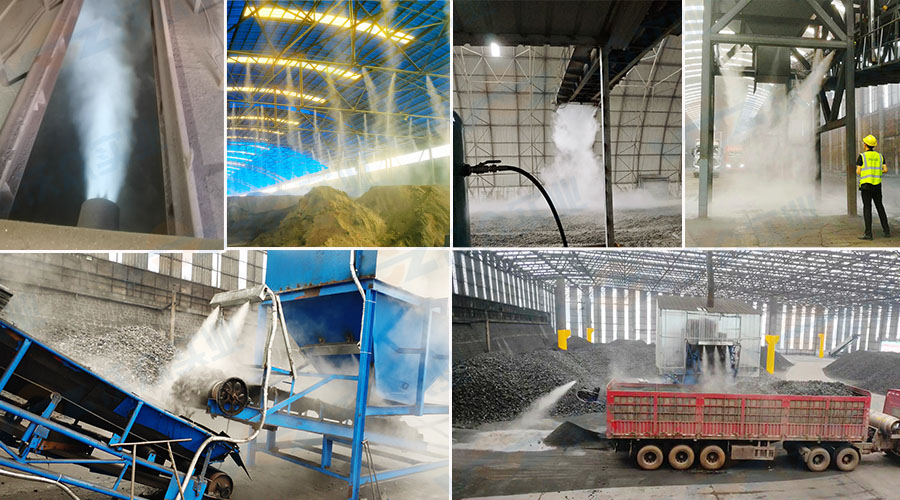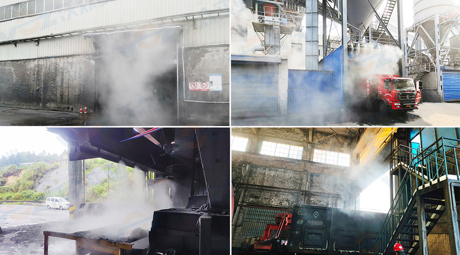 在廠房內部,物料堆積處、裝卸點、運送帶等區域,易激起粉塵的區域,設置沃眾空壓微霧抑塵設備,減少粉塵揚起,為工作人員創造良好工作環境。